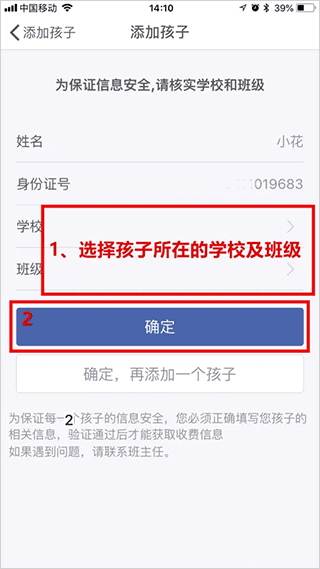 3、选择孩子所在学校和班级,完成后点击【确定】。